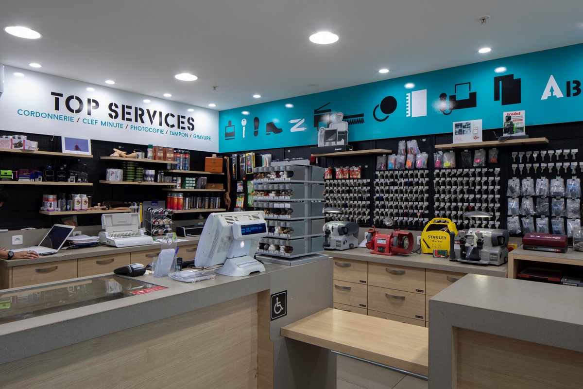 Services et travaux minute : copie des clés, fabrication tampon, gravure sur plaque, plastification, reliure, photocopie, fax, scan, cordonnerie, produits d’entretien chaussures, semelles, lacets, et autres accessoires de clés et de cordonnerie.