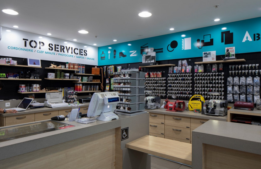 Services et travaux minute : copie des clés, fabrication tampon, gravure sur plaque, plastification, reliure, photocopie, fax, scan, cordonnerie, produits d’entretien chaussures, semelles, lacets, et autres accessoires de clés et de cordonnerie.